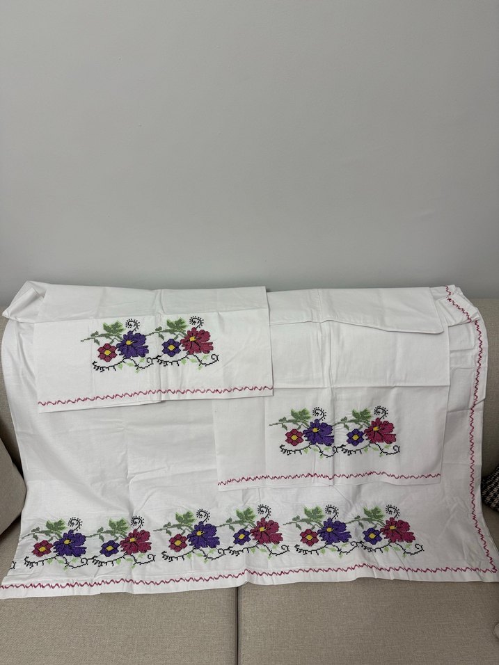 Renkli çiçek işlemeleri ve süslü kenarlı yatak kenarlığı ve masa örtüsü olarak da kullanılır 3 adet vardır yastık kılıfı 2 çift tek vardır