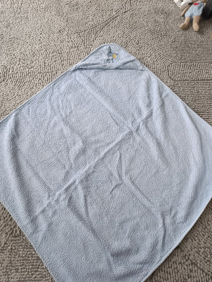 köşesinde nakışlı detaylı mavi Bebek banyo havlusu. Köşe kapüşonlu, ekstra rahatlık sağlar.