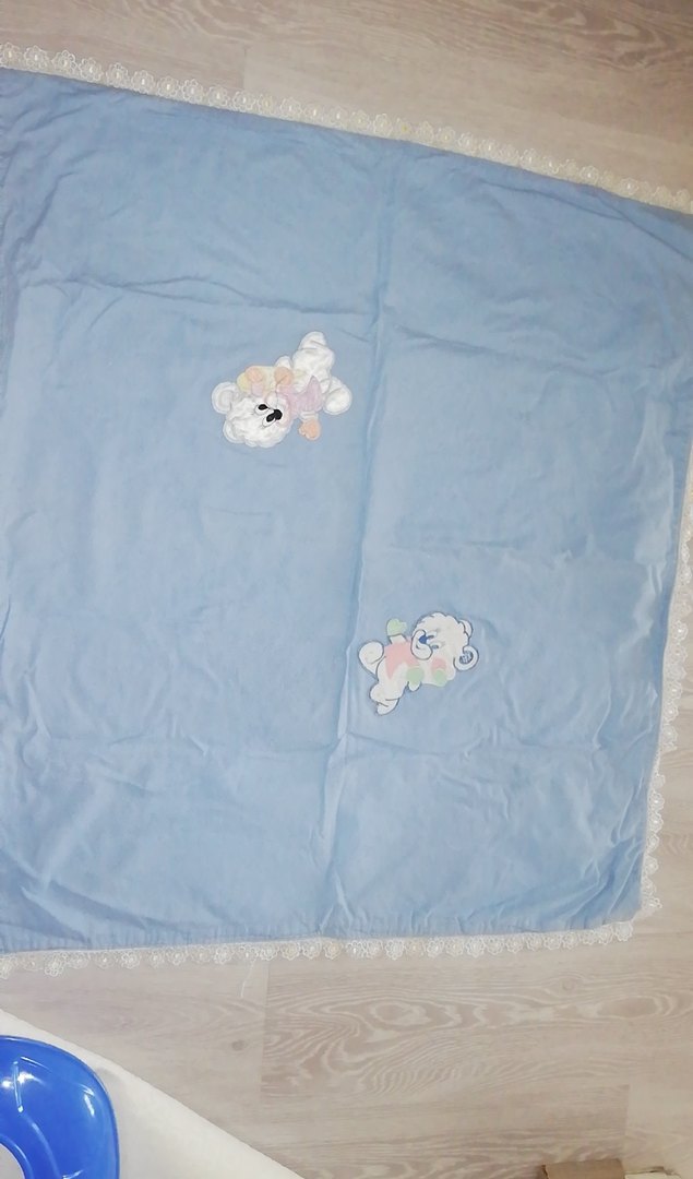 Yumuşak ve sıcak kumaştan, mavi renkte, pastel tonlarda nakışlı hayvan desenleri ve dantelli kenarları olan çocuk battaniyesi.
