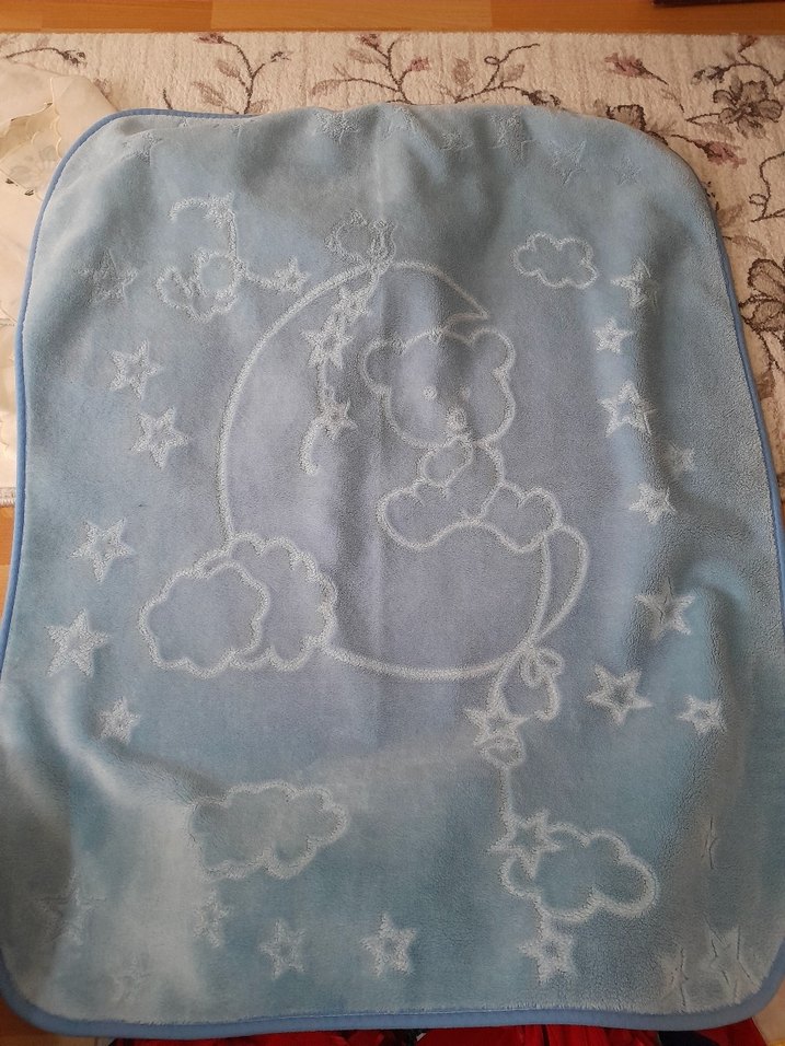 Nakışlı ay, ayıcık, yıldız ve bulut desenli yumuşak mavi bebek battaniyesi. Pastel renk hafiflik katıyor.