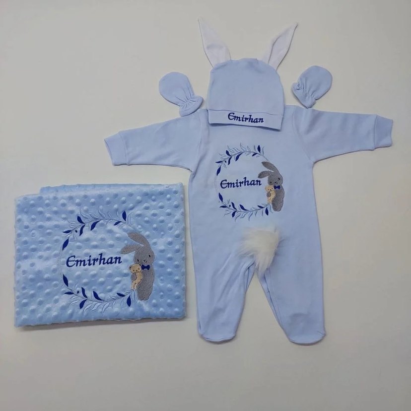 Pastel mavi, uzun kollu bebek hastane çıkışı seti, yumuşak tüylü kumaştan. Nakışlı 'Emirhan' yazısı ve tavşan figürü var. Örme kulaklı şapka ve eldivenler ile birlikte, nakışlı battaniye de dahil. hazırlanma aşaması vardır