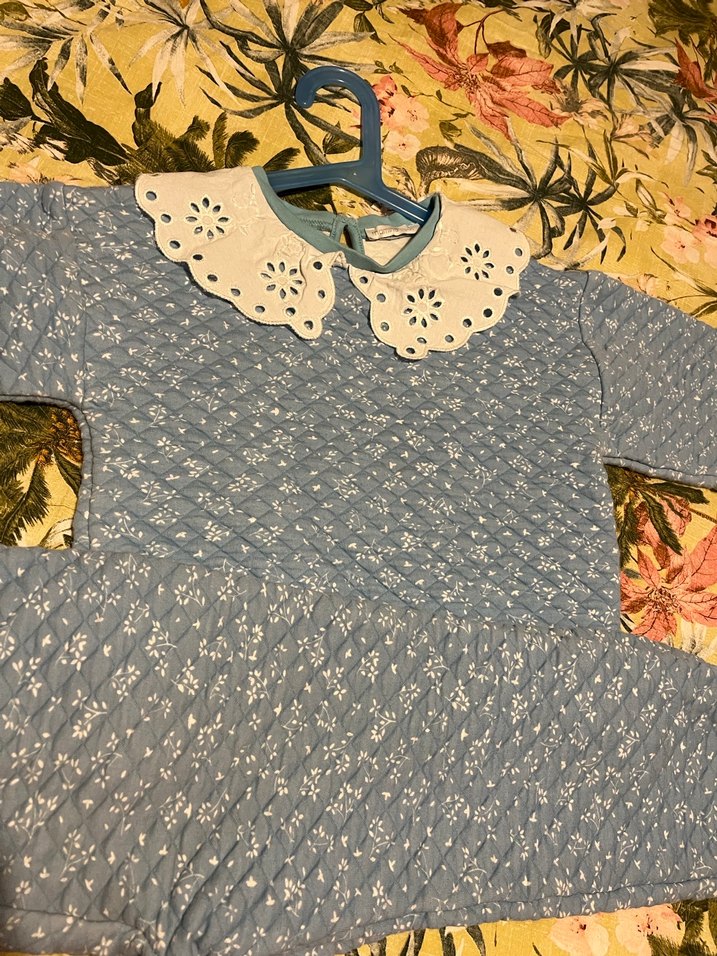 Nakışlı detaylara ve beyaz süslü yakaya sahip açık mavi bebek önlüğü. Yumuşak kumaş ve zarif desenler içerir.