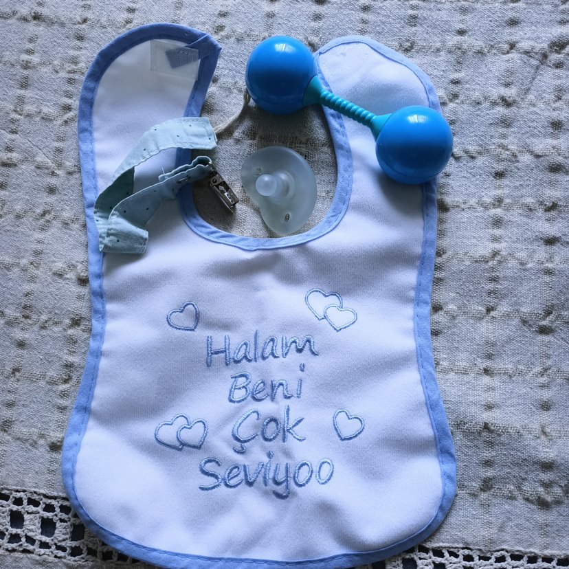 Nakışlı Mavi Bebek Önlüğü& emzik ve tutucu& çıngırak