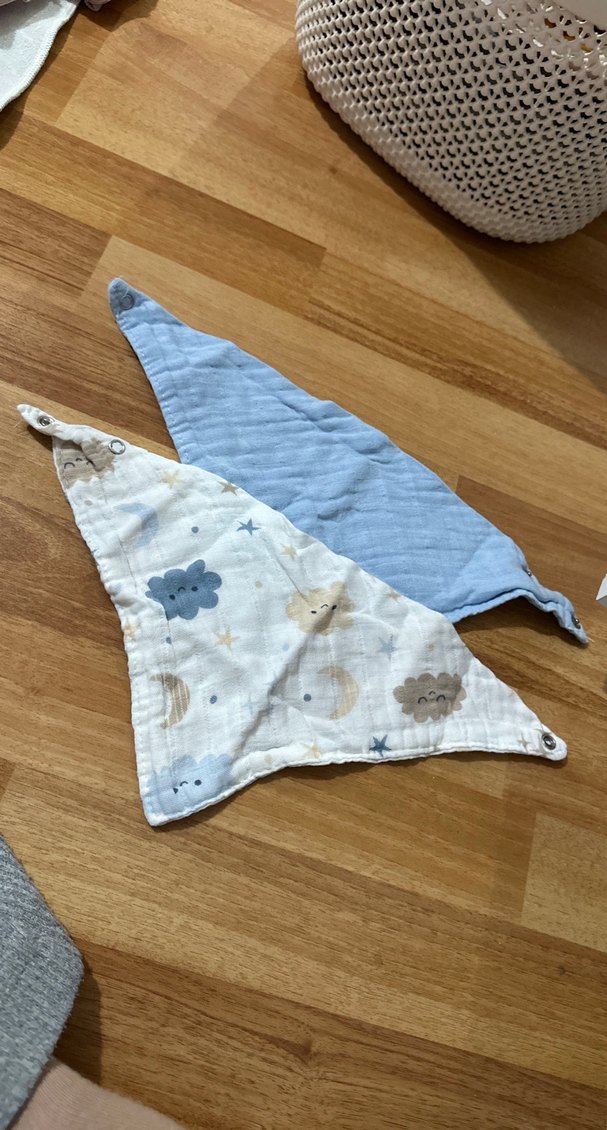 Pastel mavi tonlarında iki adet bebek önlüğü seti. Birinde nakışlı gökyüzü desenleri, diğerinde düz açık mavi renk bulunur. Yumuşak ve konforludur.