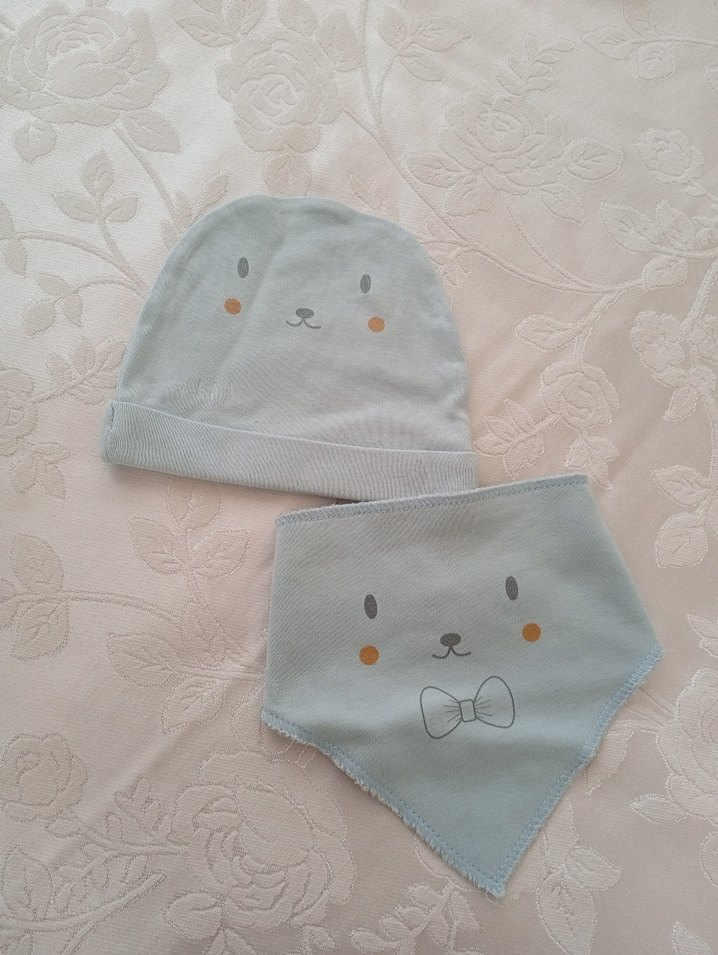 Yumuşak pastel mavi renkli, nakışlı hayvan yüzleri ve fiyonk detaylı bebek önlüğü ile şapka seti.