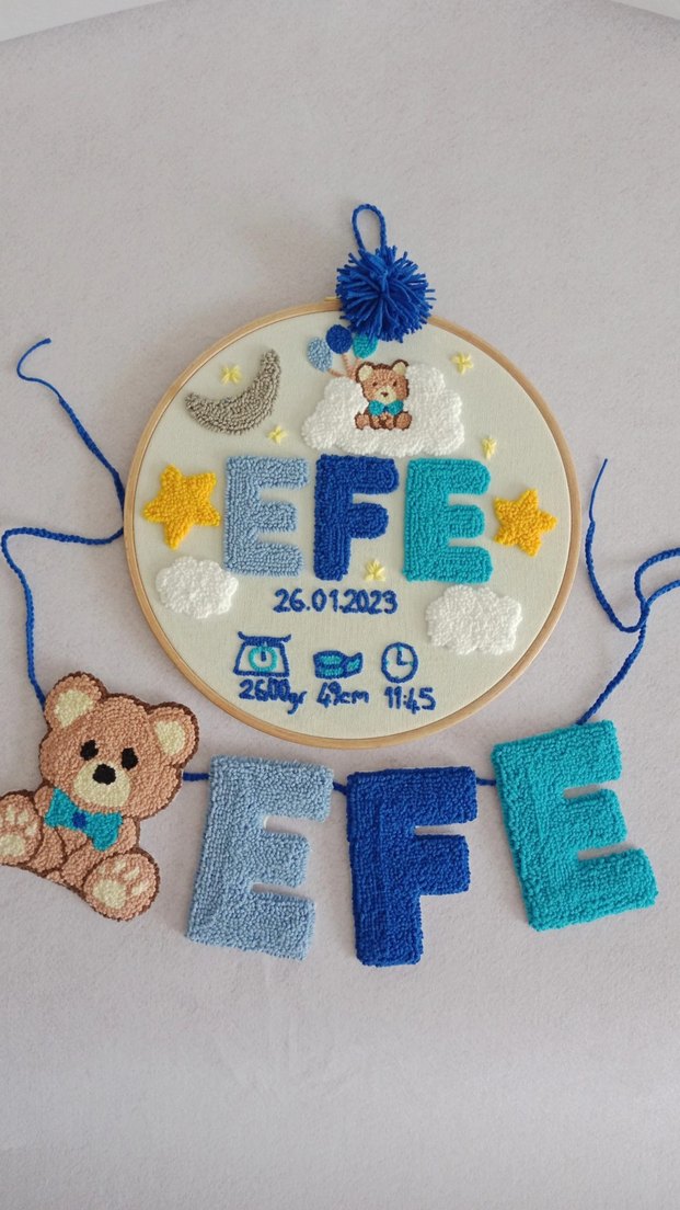 Punch işleme Bebek odası çocuk odası süsü istenilen modelde işlenir Yumuşak kumaştan yapılmış, isim, tarih ve doğum bilgileri içeren mavi nakışlı bebek süsleme seti. Ayıcık ve yıldız figürleri bulunur.