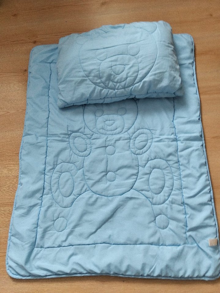 Nakışlı ayıcık desenli, yumuşak ve sıcak dokulu pastel mavi bebek uyku seti; yorgan ve yastıktan oluşur.