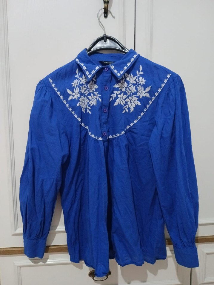 Bu koyu mavi keten gömlek, uzun kollu, yakalı ve beyaz çiçek nakışlıdır. Bol kesim ve düğmeli, bohem tarzı yansıtır.