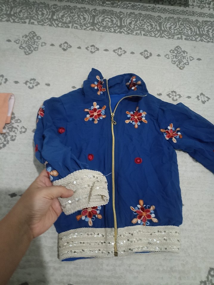 Renkli nakışlarla süslenmiş, mavi tekstil kumaştan, normal uzunlukta ve dar kesim bohem kadın ceketi. Notlu yaka, uzun kollu ve fermuarlı. Etek kısmında dantel ve pul detayları bulunur. Düğün için uygun.
