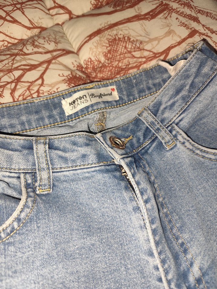 Mavi kot pantolon, düğmeli ve nakışlı detaylara sahip. Bohem tarzda, normal boyda ve rahat kesimdir. Günlük kullanıma uygundur. sorunsuzdur