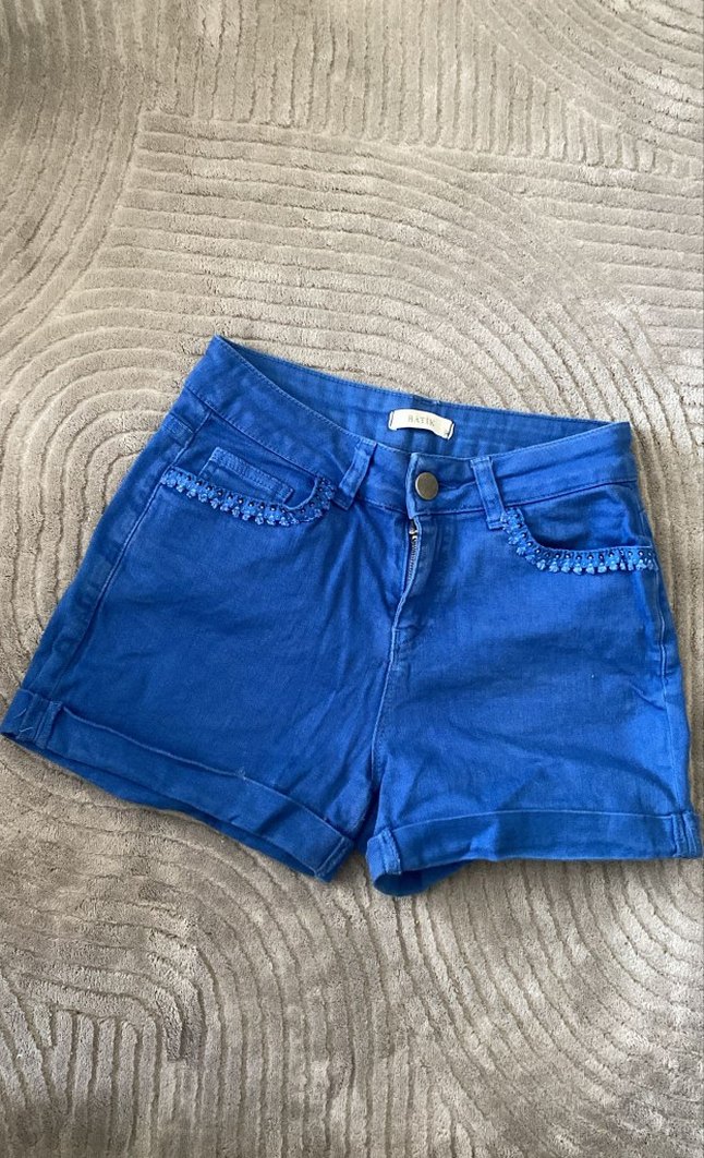 Düğmeli, nakışlı detaylara sahip bol kesim mavi denim mini şort. Parlak yüzeyiyle günlük bohem stile uygun.