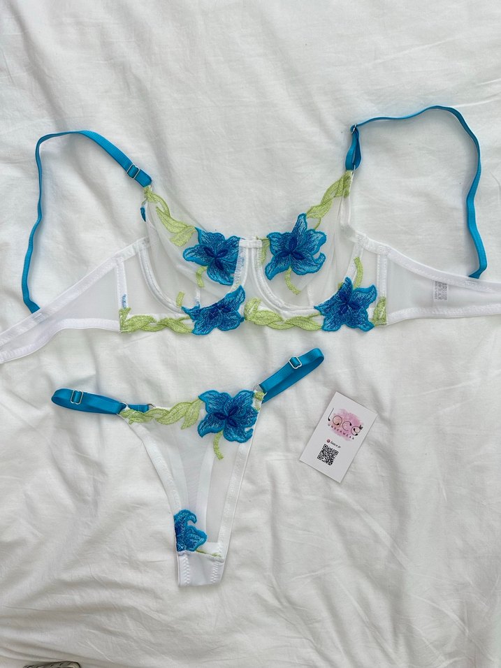 Nakışlı çiçek desenli, ayarlanabilir askılı, pastel mavi renkli bohem ve Paris tarzı kısa uzunlukta sütyen.