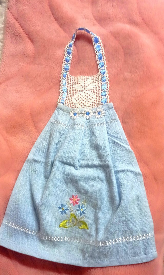 Pastel mavi renkte, Önlük model nakışlı çiçek desenleri ve dantel detaylı bohem tarzda mutfak havlusu.