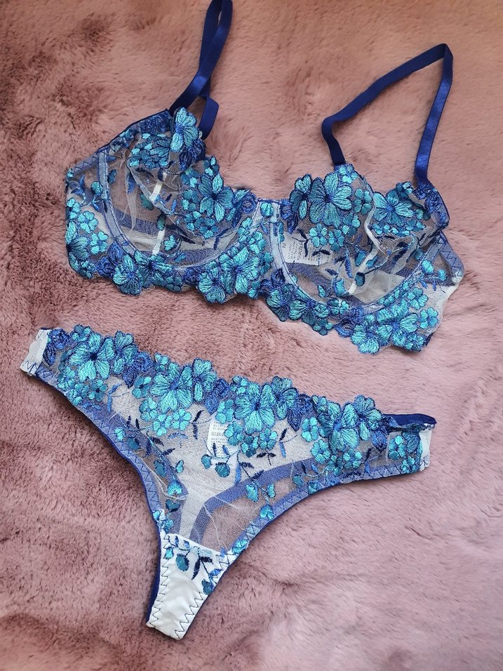 Koyu mavi renkli, nakışlı çiçek desenleriyle bohem tarzında, şeffaf ve hafif kumaştan sütyen ve külot takımı.