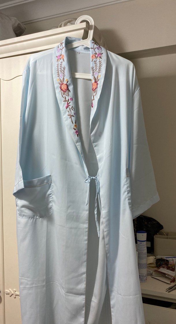 Pastel mavi renkte, nakışlı yakasıyla bohem tarzda, uzun kollu, bol kesim uzun kadın sabahlık. Bağcıklı ve ön cepli.