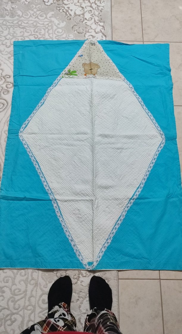 Mavi renkte, nakışlı ve yumuşak dokulu çocuk battaniyesi. Elmas şeklinde merkezi desenle renkli ve eğlenceli bir tasarıma sahiptir.