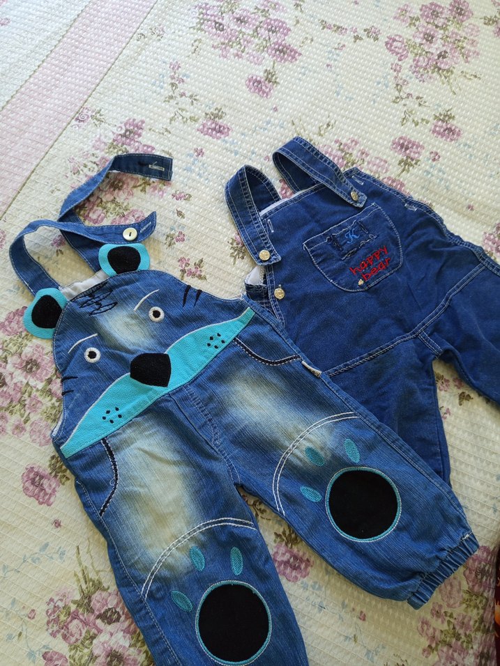 Nakışlı ve renkli detaylara sahip, askılı ve tokalı mavi denim erkek çocuk tulumu, koyu lacivert olan 9-12 ay diğeri 12-18 ay arasıdır içlerine body de hediye olarak eklerim