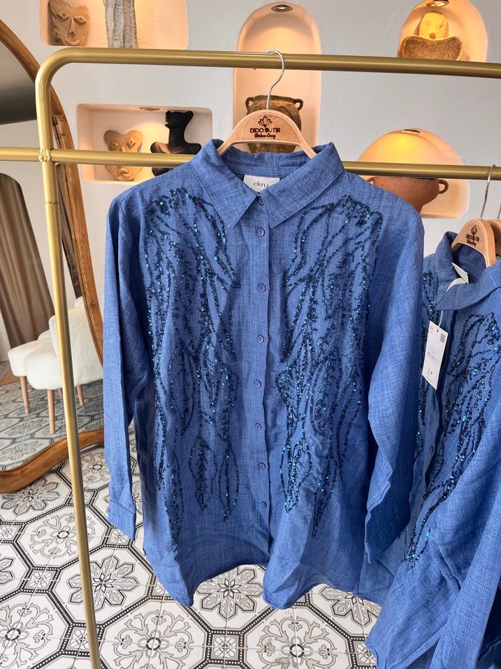 Bu bol kesim mavi denim gömlek uzun kollu, yakalı ve düğmeli olup, parlak nakışlı desenlerle süslenmiştir. Bohem tarz için uygun.