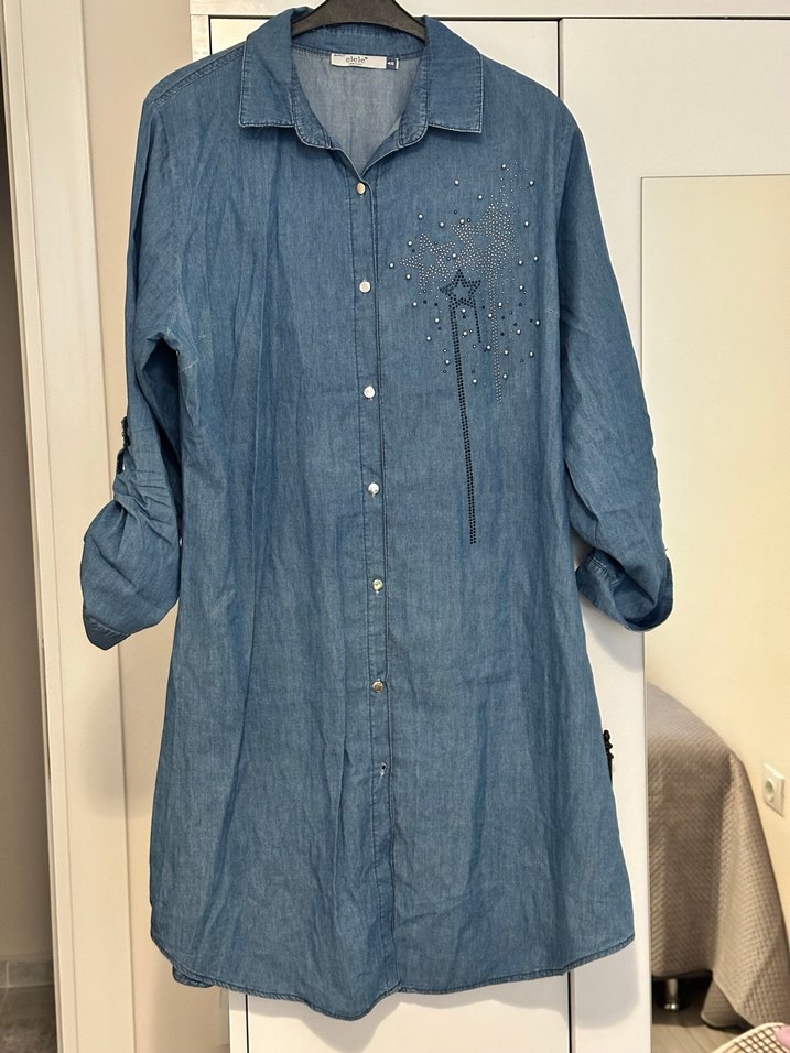 Mavi denim gömlek elbise, düğmeli ön, uzun kollu ve kesikli yaka detayına sahiptir. Nakışlı ve parlak yüzeyli, rahat kesim ve günlük sokak stili için uygundur.