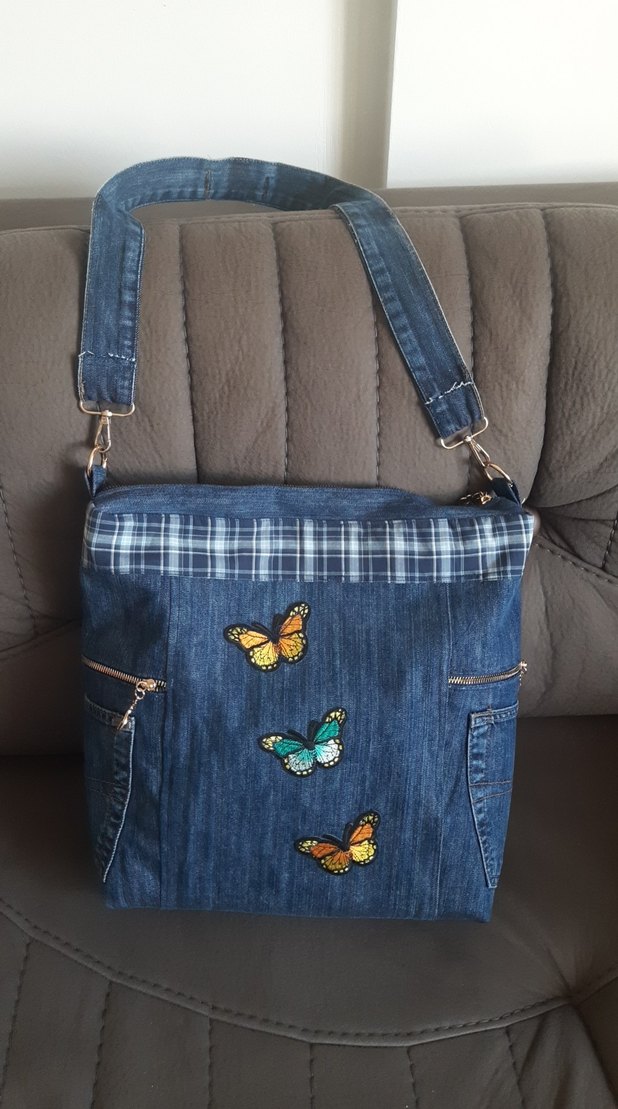 Nakışlı kelebek desenleri ve fermuarlı kapanışıyla mavi denim kadın çanta, bohem tarzda günlük sokak kullanımı için uygundur.El emeği, çok kullanışlı.