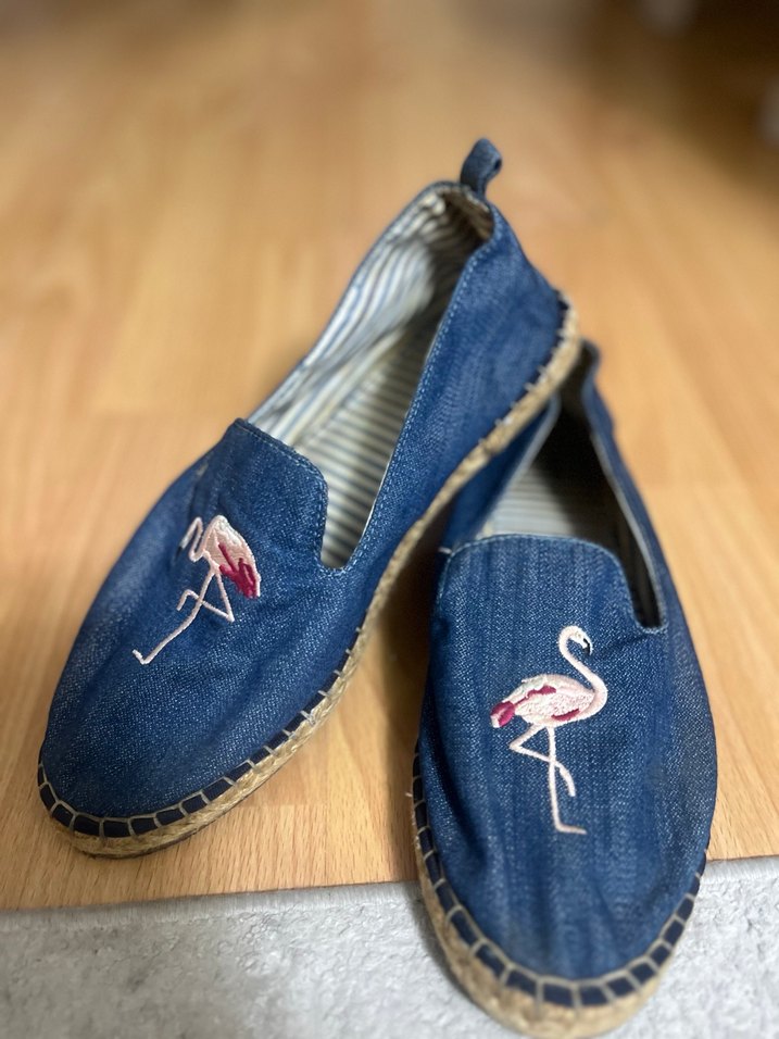 Renkli flamingo nakışlı, mavi denim espadril. Düz taban pileli detaylı, gündelik bohem tarz için uygun.