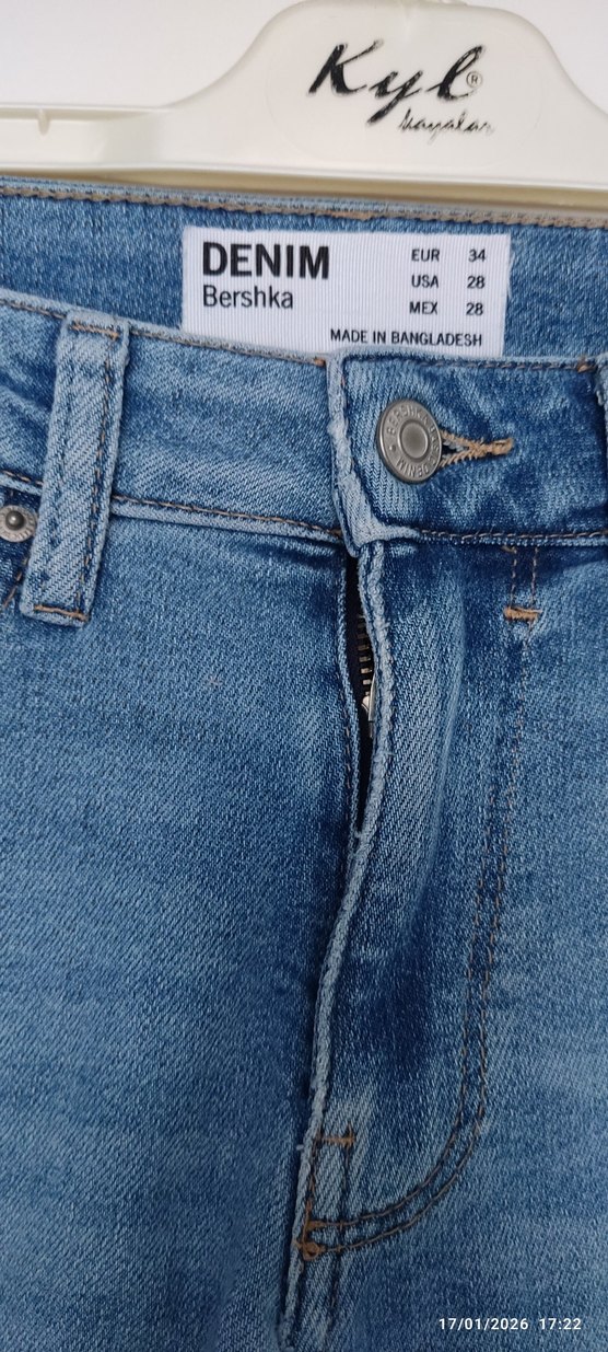 Bershka marka, düğmeli, nakışlı detaylı, parlak mavi denim kumaştan, normal boy, rahat kesim kadın jean.
