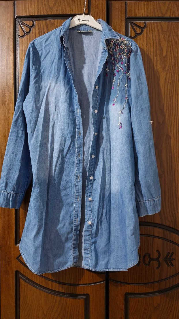 Nakışlı Mavi Denim Kadın kot Gömlek