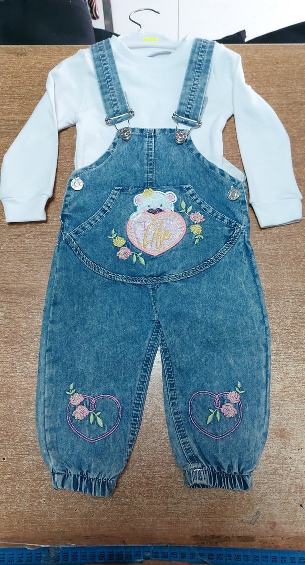 Renkli nakışlı ayı ve kalp detaylı, bol kesim mavi denim kız çocuk tulumu. badili 2'li askılı takım