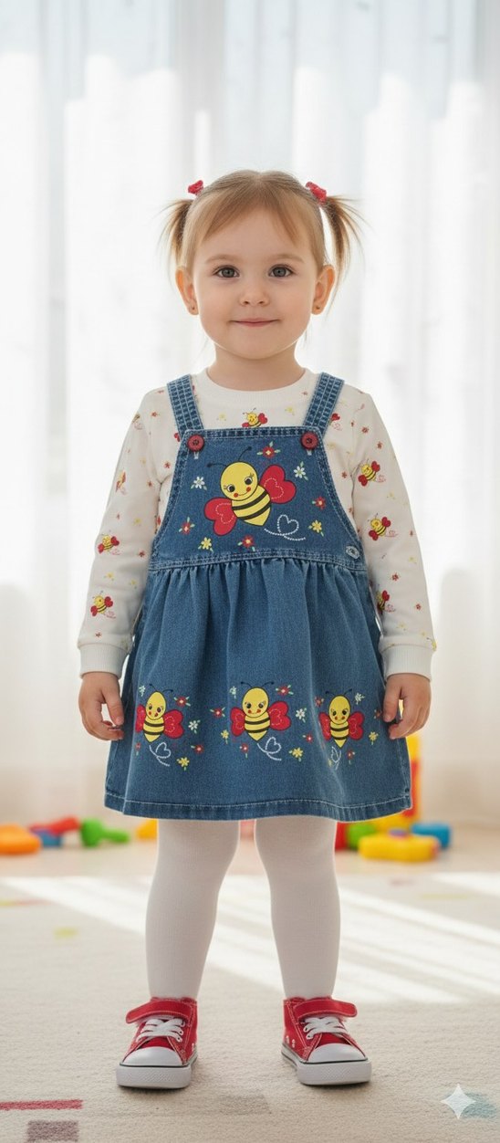 Bu fitted denim kız elbisesi uzun kollu, yuvarlak yakalı ve renkli nakışlı arı desenlerine sahiptir. Trendi yansıtan örme detaylar bulunur.