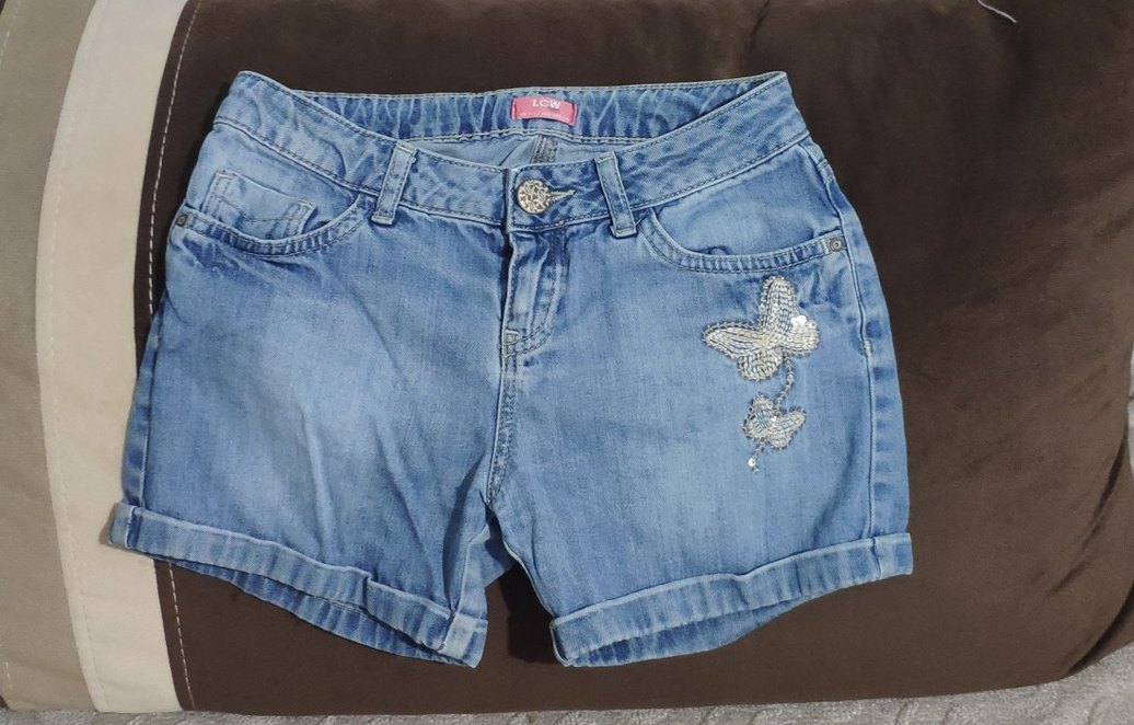 Nakışlı kelebek desenli, düğmeli ve bol kesim mavi denim kız şortu, rahat sokak stili için uygundur.