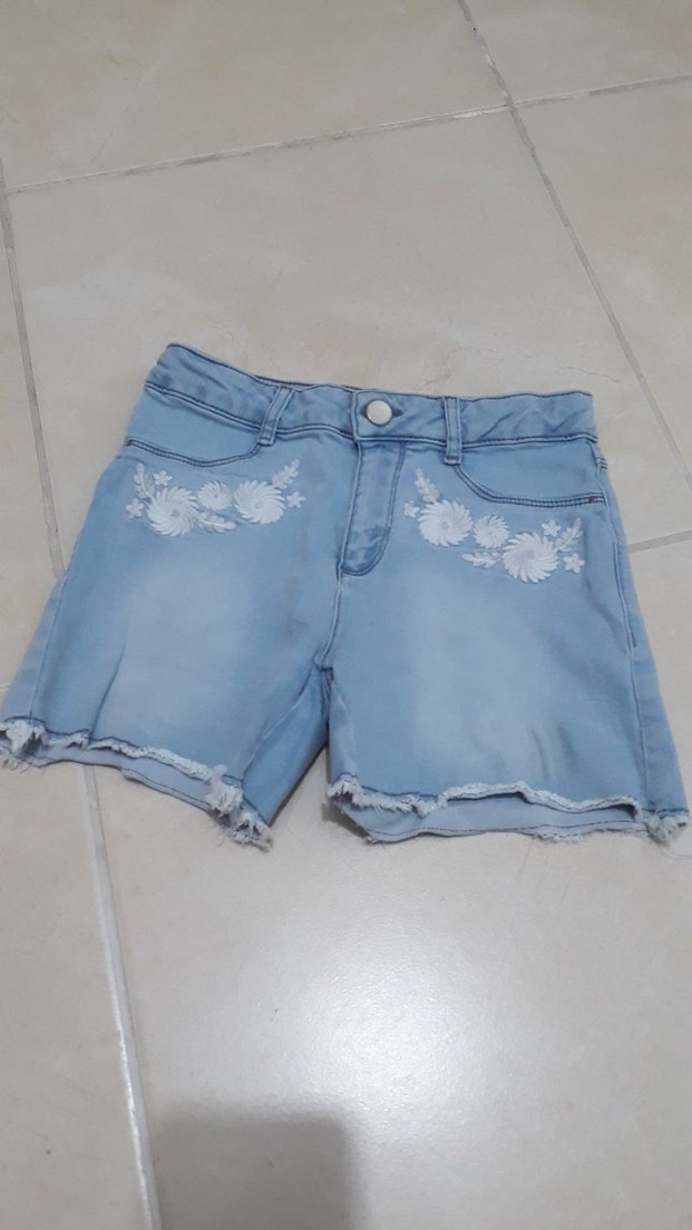 Beyaz çiçek nakışlı, düğmeli, bol kesim mavi denim kız şortu. Pastel tonlarda, sokak stili için uygun.