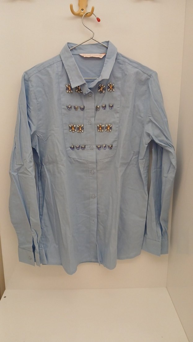 Mavi renkli, nakış detaylı, uzun kollu, düğmeli ve regular fit kadın gömleği. Sıradan uzunlukta, sokak modasına uygun, sentetik kumaştan üretilmiştir.