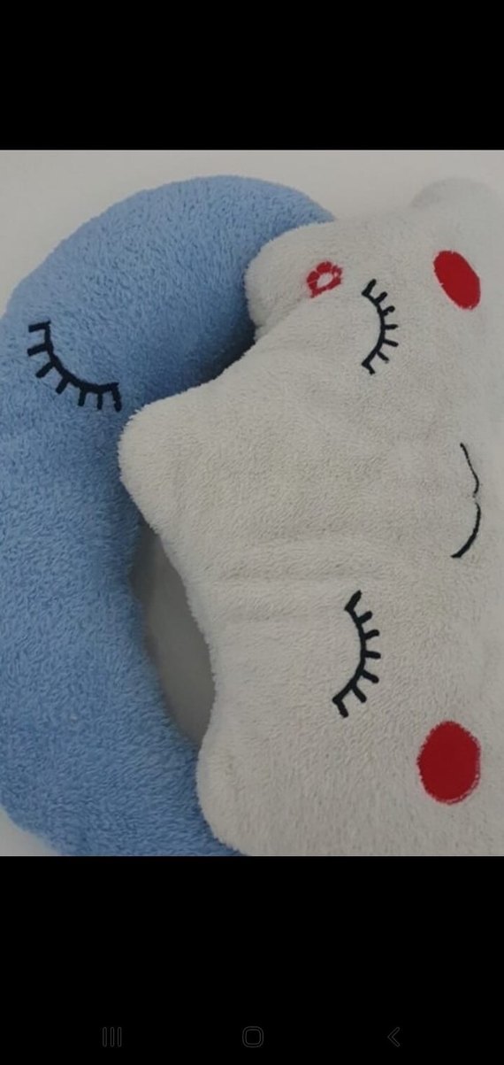 Nakışlı, uyuyan yüz desenli, yumuşak ve renkli mavi hamilelik ve emzirme yastığıdır.