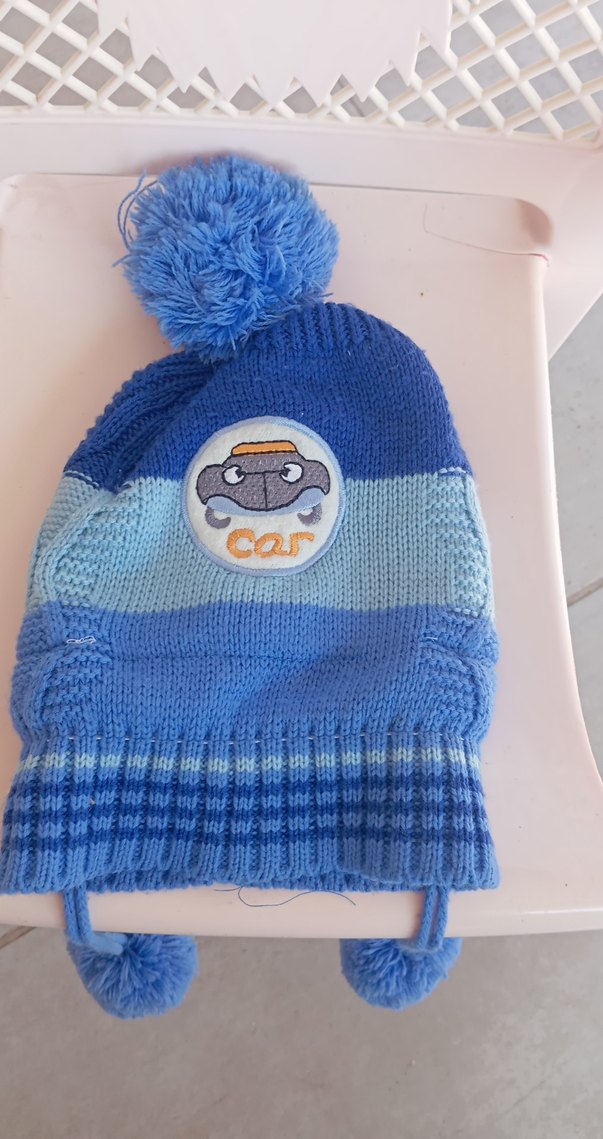 Nakışlı araba desenli, renkli çizgili mavi erkek çocuk örgü bere, üstünde ponpon ile tamamlanmıştır.