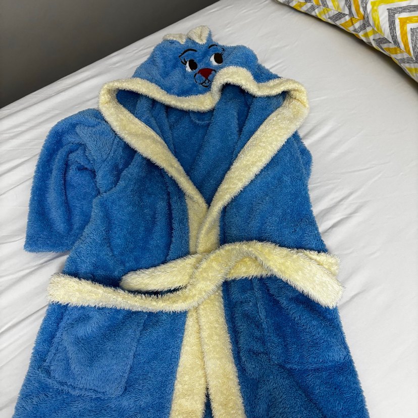 Nakışlı desenli, mavi renkli erkek çocuk bornozu, krem rengi yumuşak kemer ile kapüşonlu tasarıma sahiptir.