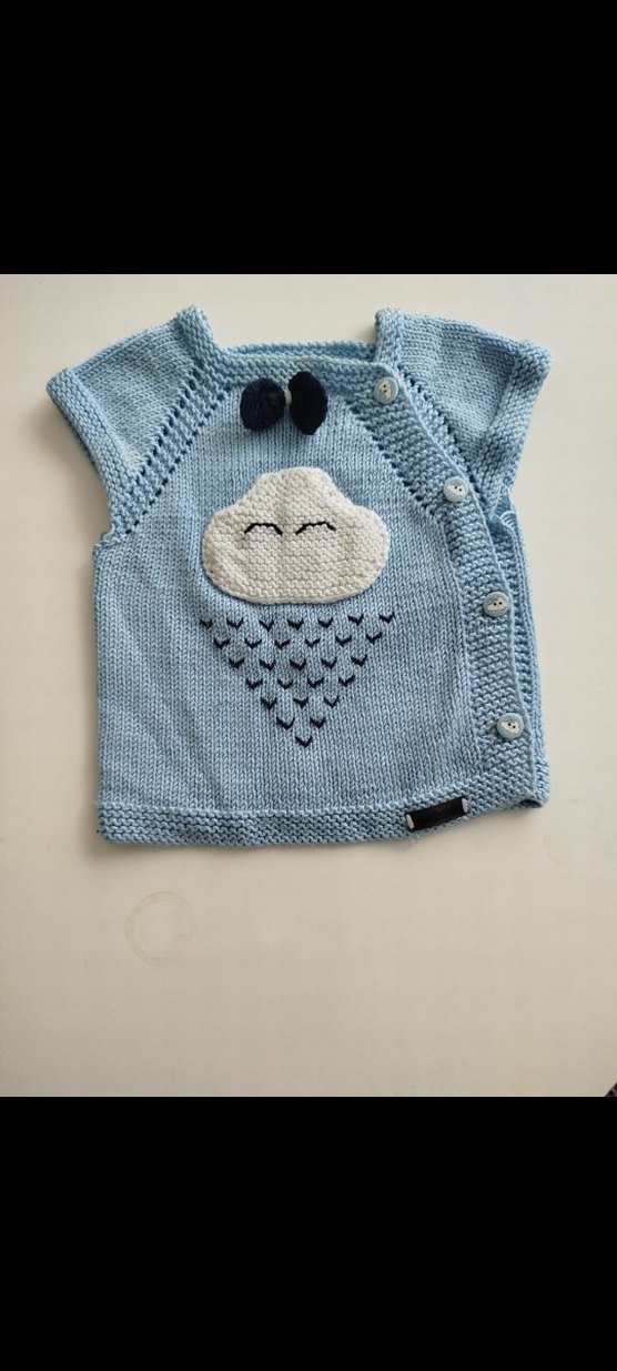 Pastel mavi renkte, nakışlı bulut deseni bulunan, kolsuz, yuvarlak yaka, bol kesim erkek çocuk örme yelek. Yan tarafında düğmelerle kapanır. ☁️