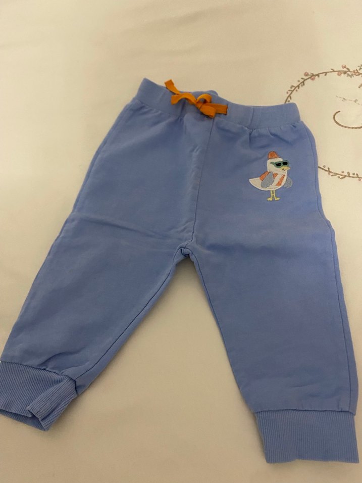 Düğmeli detaylı, renkli kuş nakışlı, mavi renk erkek çocuk pantolonu. Yumuşak ve sıcak kumaştan, rahat kesimle sokak stiline uygun.