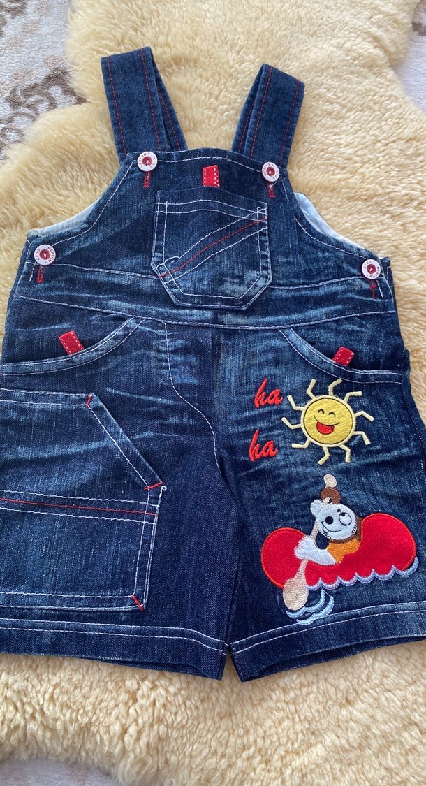 Renkli nakışlı güneş ve köpek desenleriyle, düğmeli ve cepli, ince kesim kolsuz erkek kot salopet. ☀️