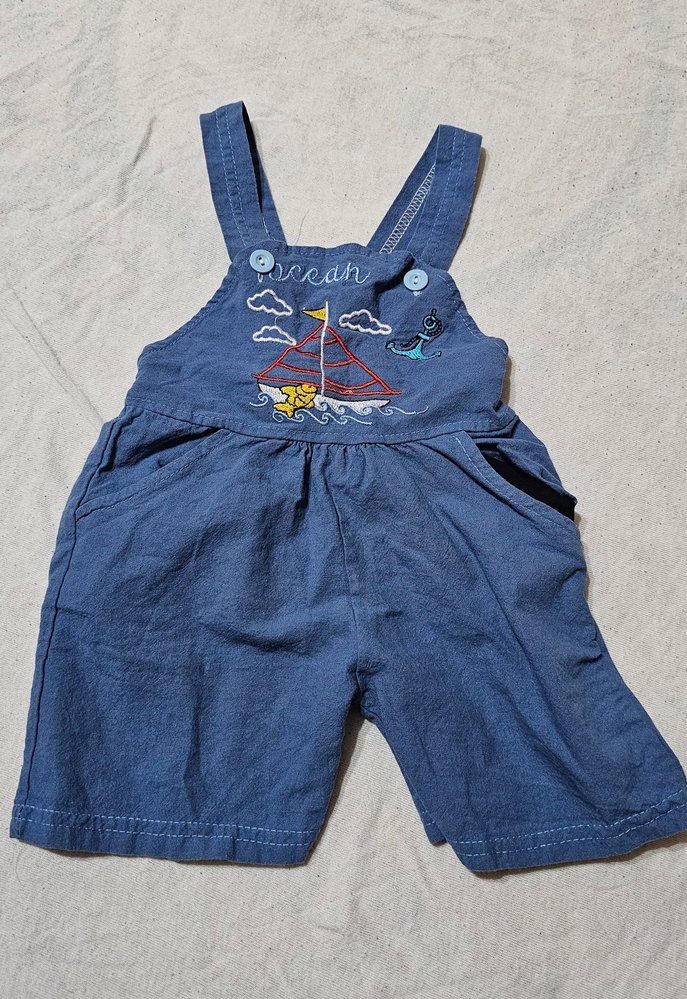Rahat kesim, kolsuz mavi kot erkek salopet. Renkli nakışlı desenler ve ayarlanabilir tokalı askılar içerir. Sokak stiline uygun.
