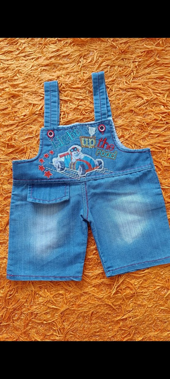 Rahat kesim mavi kot kumaştan, renkli nakışlı araba desenli, tokalı askılı erkek çocuk şort salopet.