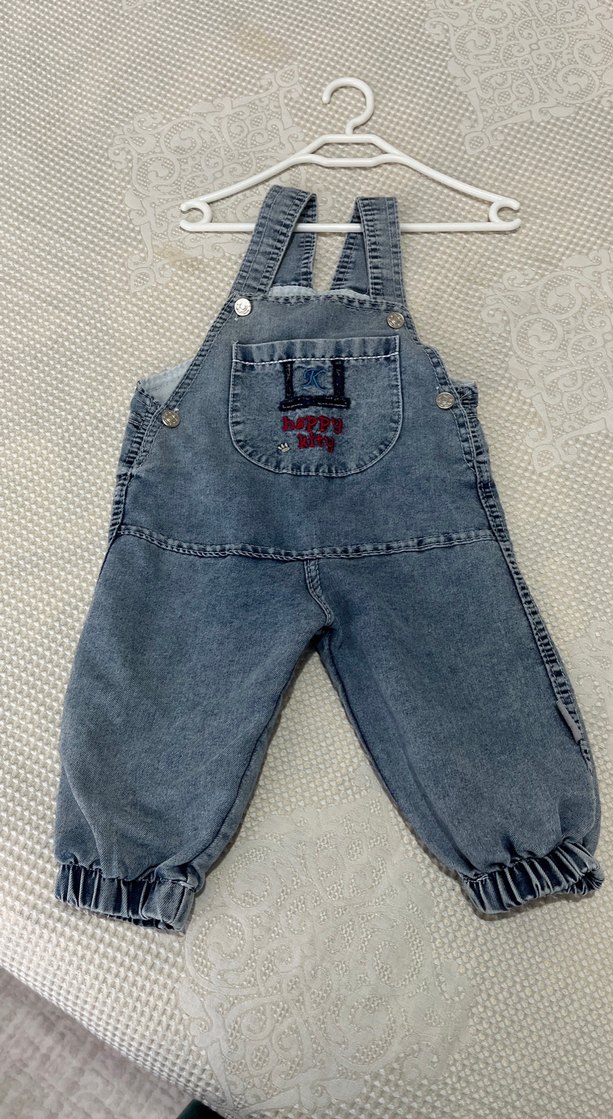 Nakışlı ön cep, tokalı ayarlanabilir askılar ve lastikli paçalarla bol kesim mavi kot erkek tulum. Rahat sokak tarzı.