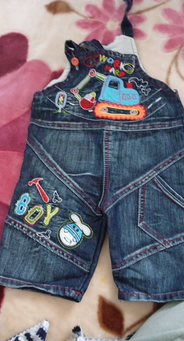 Nakışlı renkli desenlere sahip, düğmeli askılı, fitted mavi erkek kot tulum. ️