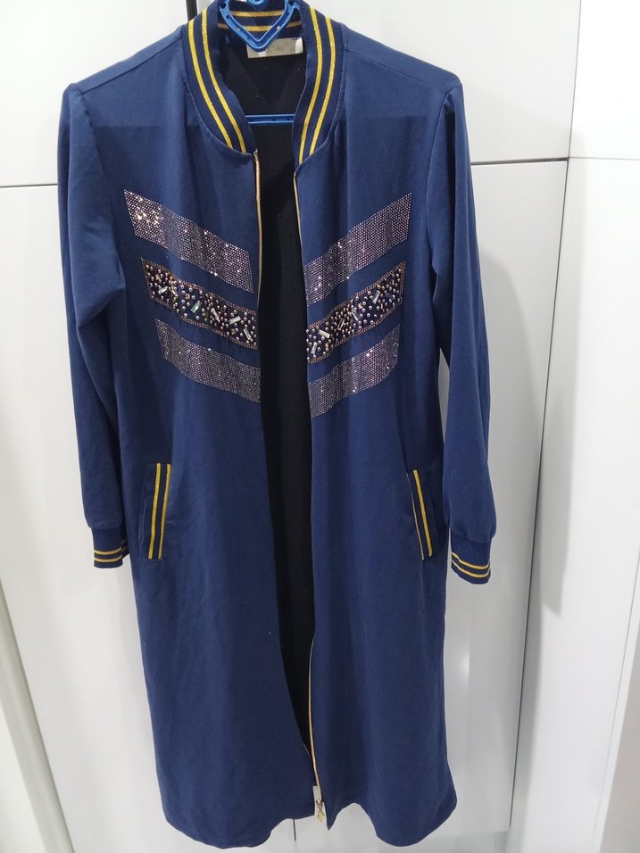 Mavi renkli, fermuarlı kadın ceket, bisiklet yaka ve uzun kolludur. Renkli nakış desenleri ve dar kesimiyle günlük kullanıma uygundur. Sentetik kumaştan, normal midi boyda üretilmiştir.