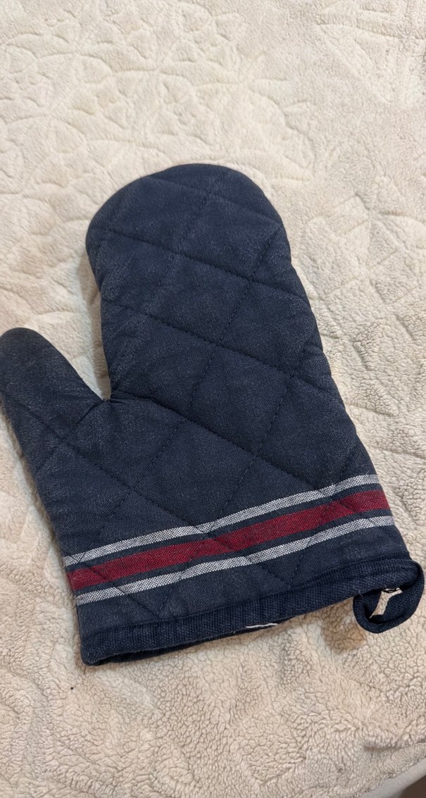 Nakış detaylı, mavi renkte, ısıya dayanıklı kapitone kumaştan yapılmış fırın eldiveni. Asma halkası bulunur.