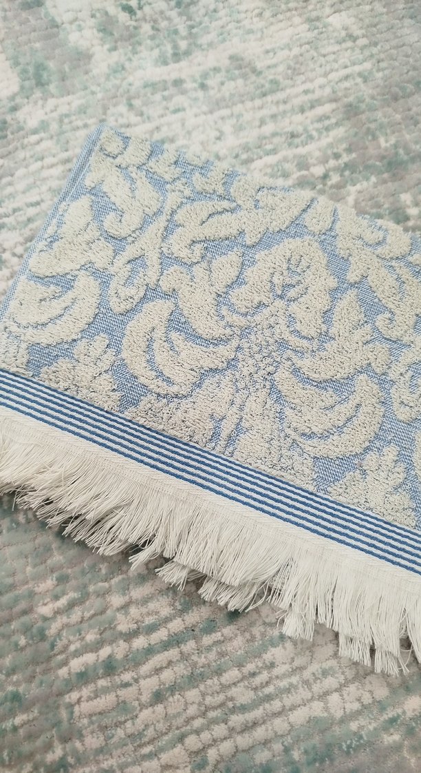 Nakışlı desenlere sahip, mavi ve gri tonlarında klasik tarzda havlu. Çizgili kenar ve püskül detayları bulunur.