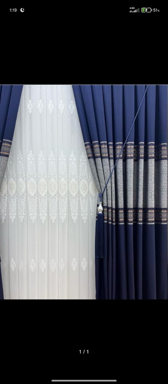 Mavi kumaş ve gri nakışlı desenlere sahip fon perde, şeffaf beyaz nakışlı tül ile tamamlanmıştır.