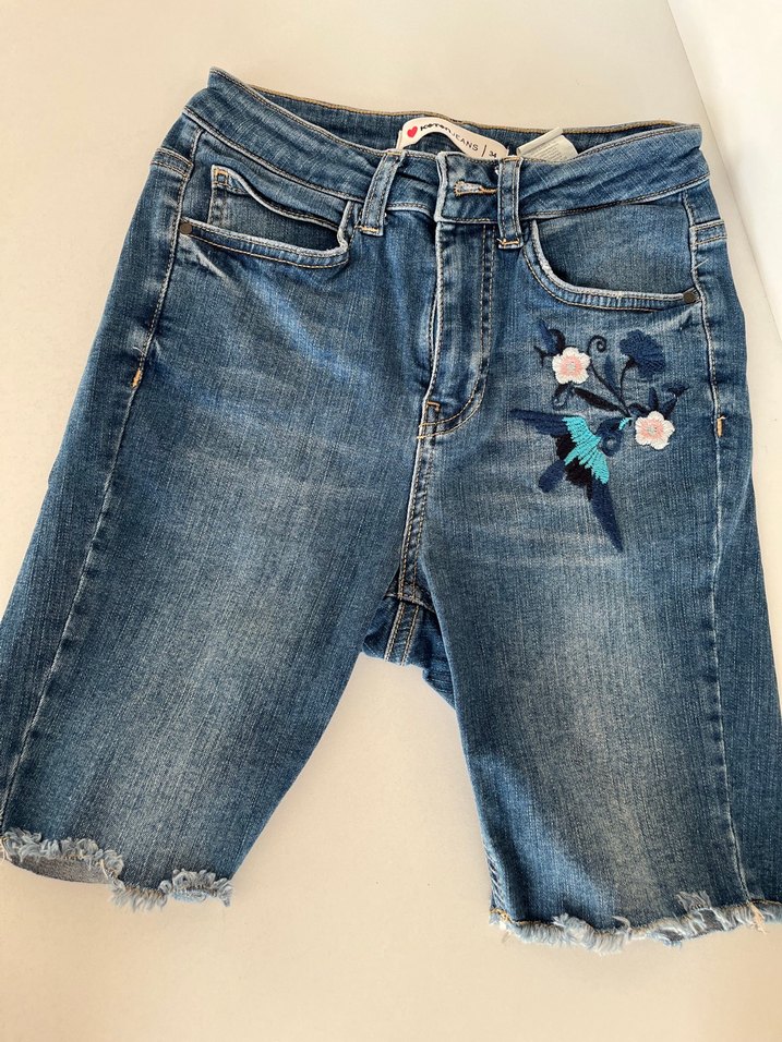 Nakışlı çiçek ve kuş desenli, düğmeli, mavi kot şort.Az kullanıldı. Çok iyi durumda.