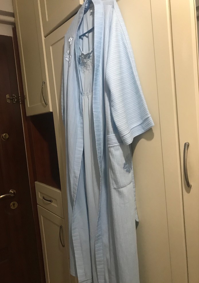 Nakışlı Mavi Gri Uzun Kadın Sabahlık gecelik