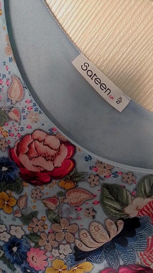 Fitted kesim mavi hamile bluzu, pastel tonlarda nakışlı çiçek desenleriyle. V yaka, askılı kollar ve düğmeli ön detaylarıyla romantik akşamlar için uygun.