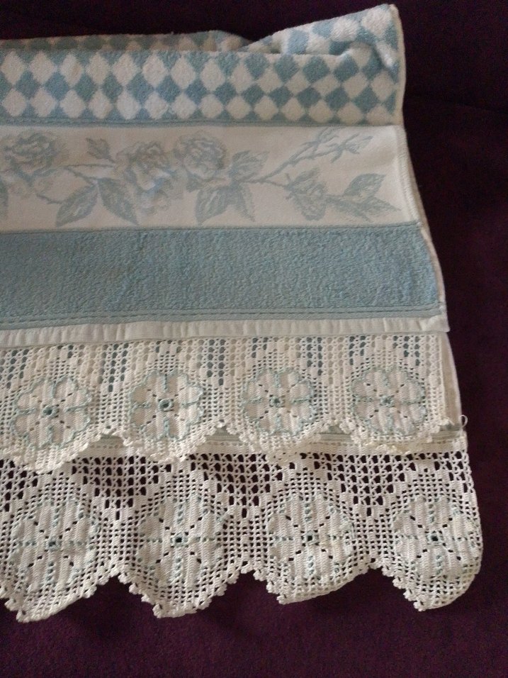 Pastel mavi renkte, nakışlı çiçek desenleri ve ince dantel uçlarıyla süslenmiş yumuşak havlu.